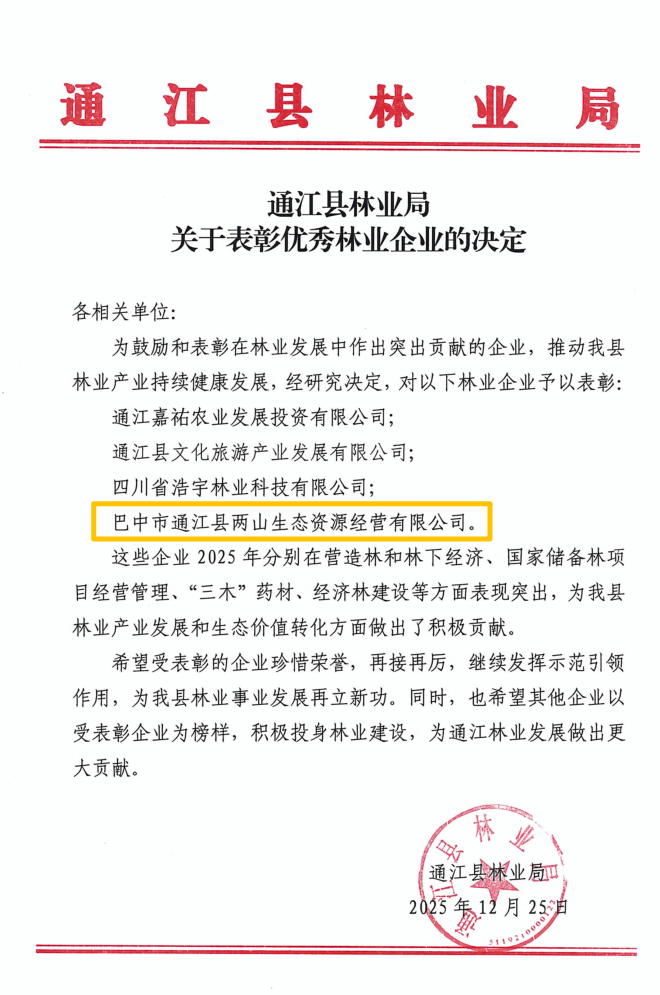近日,巴中兩山公司被巴中市林業(yè)局通報(bào)表揚(yáng)為2025年度林業(yè)重點(diǎn)工作“表現(xiàn)突出單位”。下屬企業(yè)通江縣兩山公司被通江縣林業(yè)局授予“優(yōu)秀林業(yè)企業(yè)”稱號。